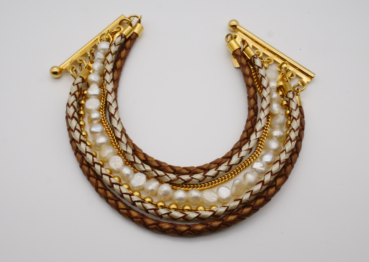 Beautiful bracelet from leather, gold chain and pearl strand. It is made of a high-end genuine leather, a 24K gold plated chain and strand of freshwater pearl. In excellent condition. Marked Hagar Satat on the tag.