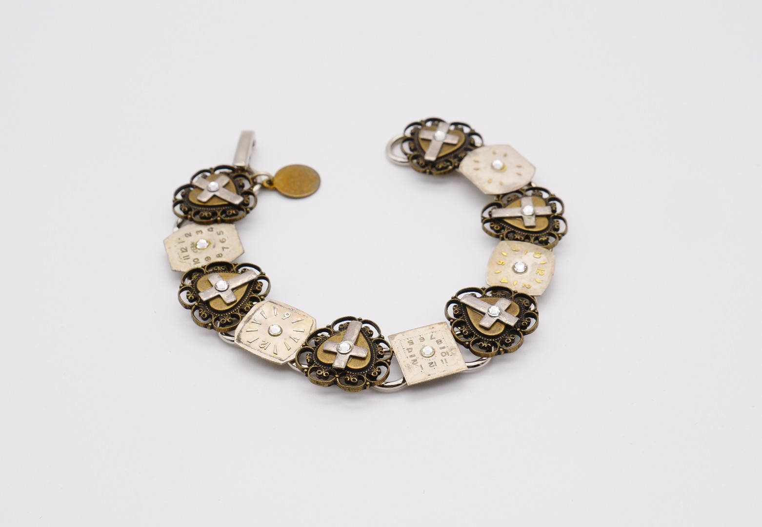 Very unique “Time for Prayer” bracelet by Lorraines Artistic Jewelry Design, Artist Designer Lorraine Frances. Made from Brass and stainless steel metal with Genuine antique watch Faces and Swarovski crystals. In great vintage condition.