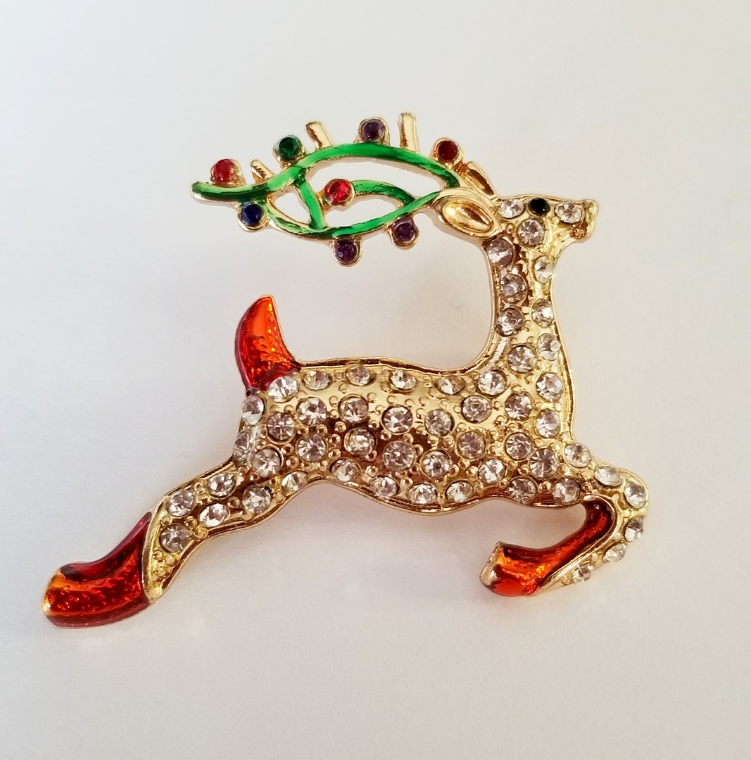 It has lovely detailed green enamel multicolor rhinestones antlers and red enamelled hooves. In great condition