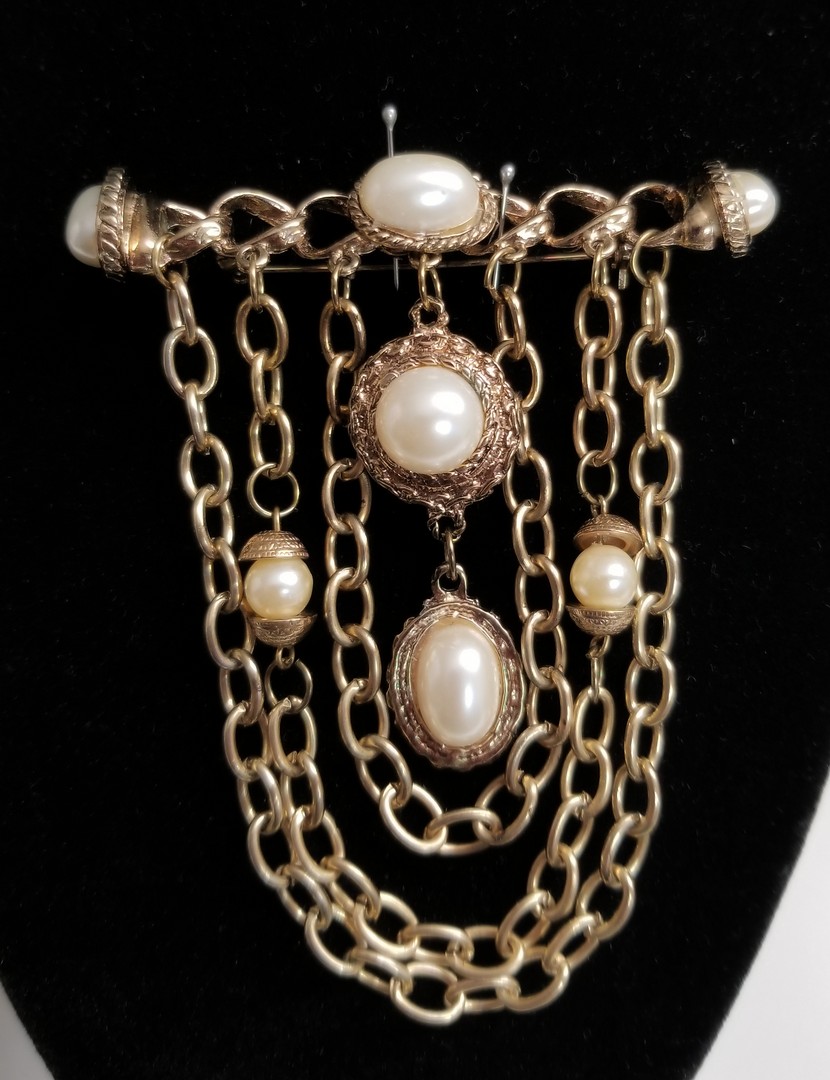 Massive three chains chatelaine bar brooch featuring with high quality faux pearl beads and cabochons. The chatelaine bar brooch is in gold tone and in great condition. Revival from Victorian Style, Vintage 1980s