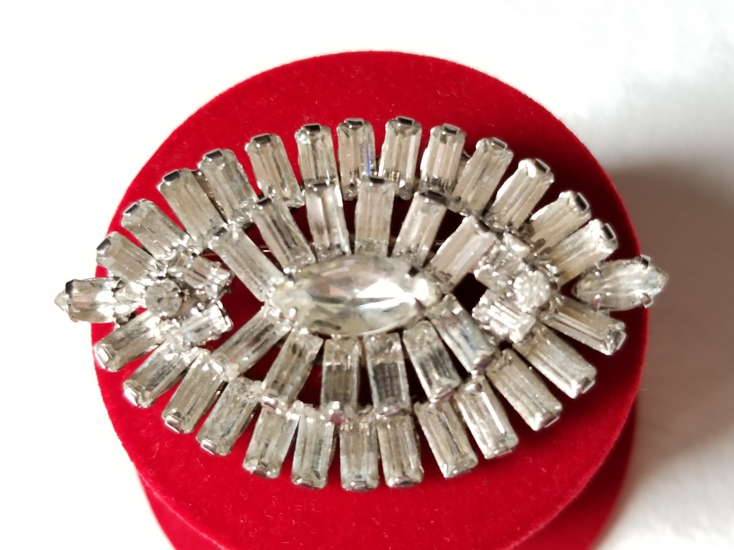 This is a beautiful oval Continental brooch. Two rows of clear Baguette Rhinestones and big Marquise crystal in the center. Silver tone metal. Clasp is in excellent condition and all stones are intact. Signed "CONTINENTAL"
