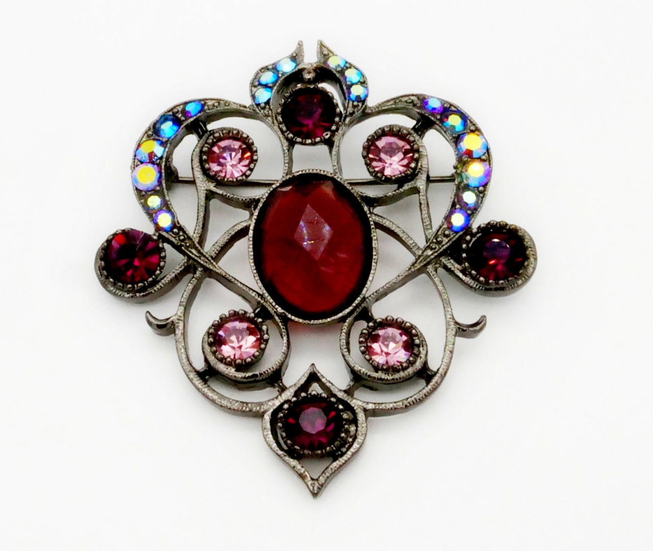 Beautiful filigree gunmetal enameled brooch 1928 brand. With purple, pink aurora borealis rhinestones. Stunning Victorian revival style brooch. Not signed but has the classic 1928 company pattern on the back.