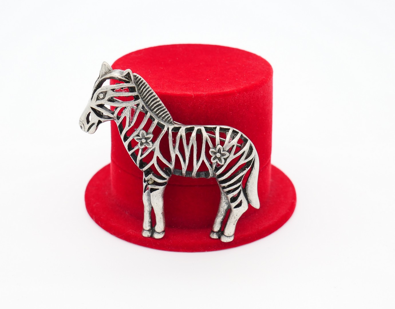 Vintage very detailed Zebra Brooch Pin with two little flowers in silver tone metal open work. Not signed. In excellent condition.