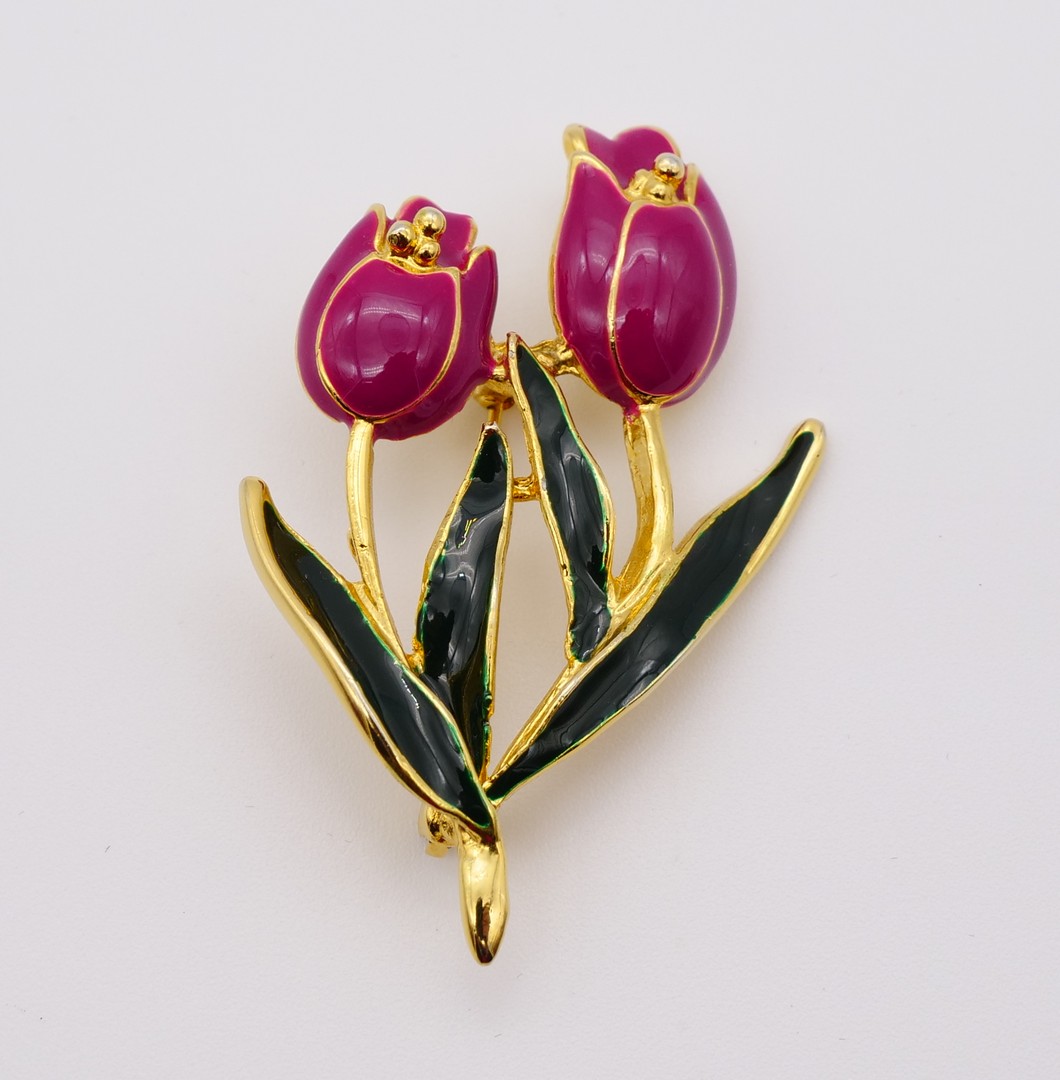 High quality enamel brooch pin gold tone metal features a pair of tulips in a violet color and in dark green leaves. Not signed. In excellent condition.