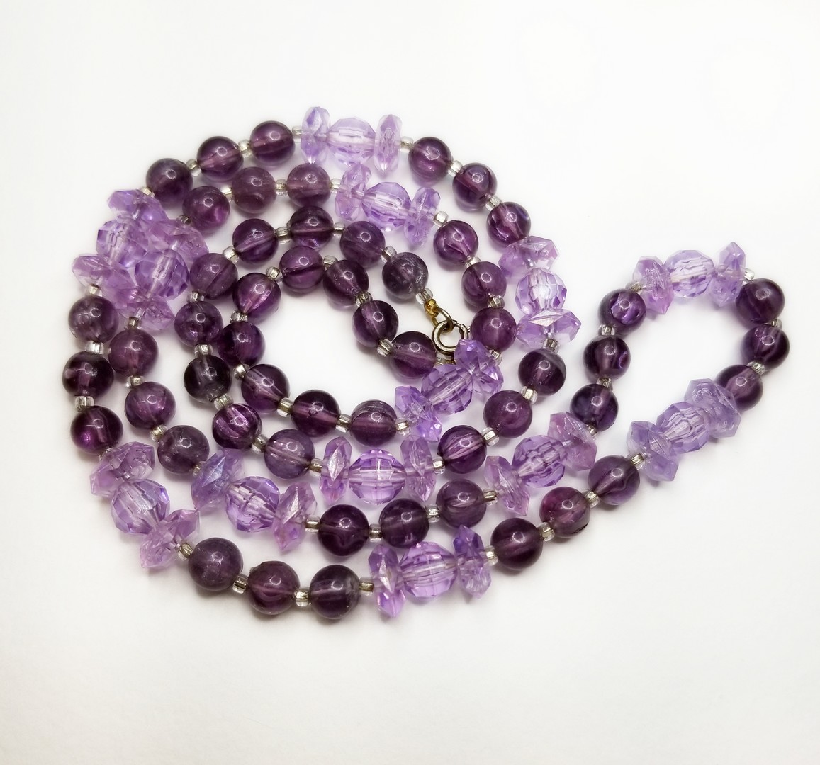 Vintage Art Deco Thermoset Early Plastic Lucite Beaded Single Strand Necklace of Translucent Purple Amethyst and Lavender Lucite beads divided by glass seed bead spacer.
