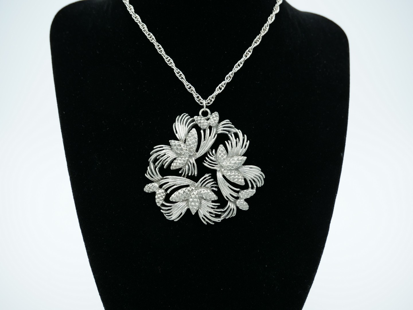 Beautiful, very detailed Pine ornament pendant. Chain with spring-ring clasp. Made in Atlantic Canada, by Aitkens Pewter Ltd. Marked Aitkens Pewter Fredericton, Made in Canada