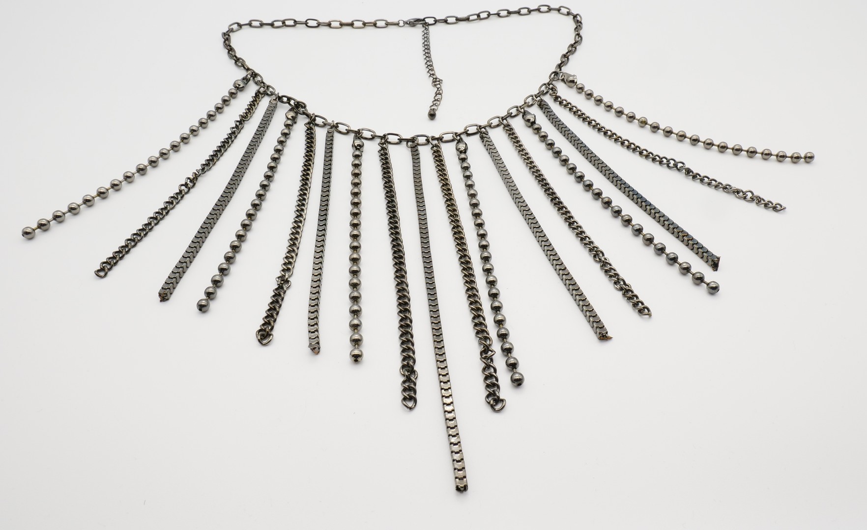 Unique Egyptian style necklace from gunmetal. The necklace features with graduated bead, box and curb types of chains. Secure with a lobster claw clasp.