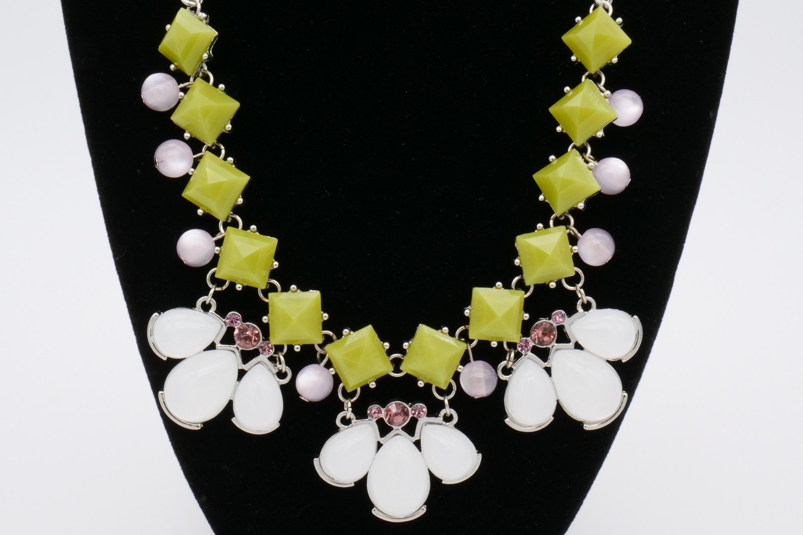 Beautiful choker necklace, silver tone chain with acrylic opaque light green and opal cabochons, acrylic lavender beads and amethyst Rhinestones. In excellent condition, Not marked. 45 cm length with extension chain. This necklace is made in Bib style.