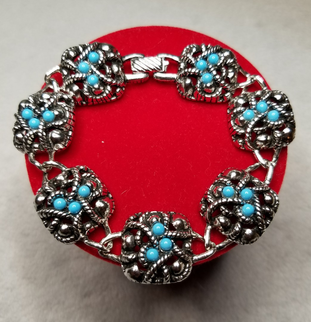 Beautiful vintage link bracelet. The bracelet features nine sections of brushed silver tone drop shape metal panels. Each section contains a faux stone cabochon such as turquoise, jade, ruby. The stones are surrounded by faux Marcasite. The bracelet has a fold over style clasp. This piece is unsigned but was well made. In excellent vintage condition.