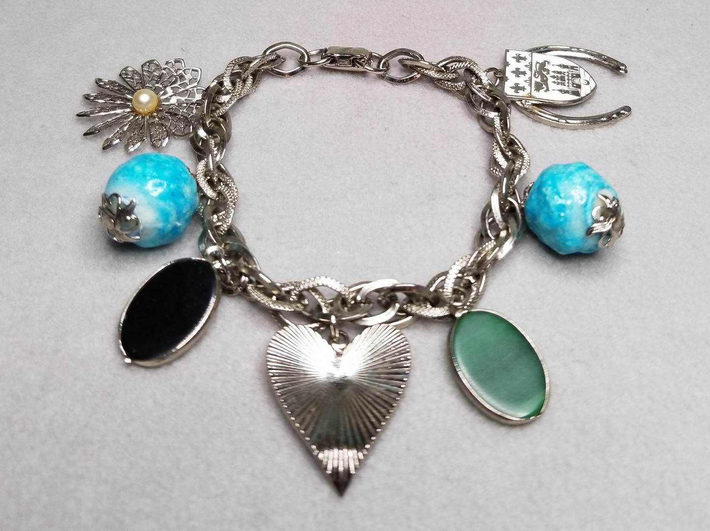 Gorgeous Vintage CORO Charm Bracelet. Silver tone metal chain, faux turquoise beads, faux malachite charm, faux black onyx charm, hart, filigree flower with pearl and horseshoe for good luck. The hart signed "Coro Pegasus", the clasp signed "Coro" without copyright sign.