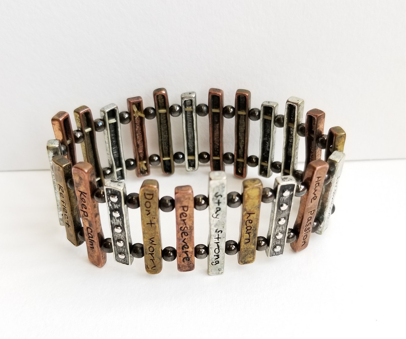 Vintage Tricolor Metal Brass, Copper and Silver Bracelet. The pieces of bracelet Engraved with blessed Thankful words. Stretch Expansion Bracelet, 20cm x 3.5 cm in the resting position, but can expand to fit almost any size wrist. Vintage, 1980s. In very good vintage condition.