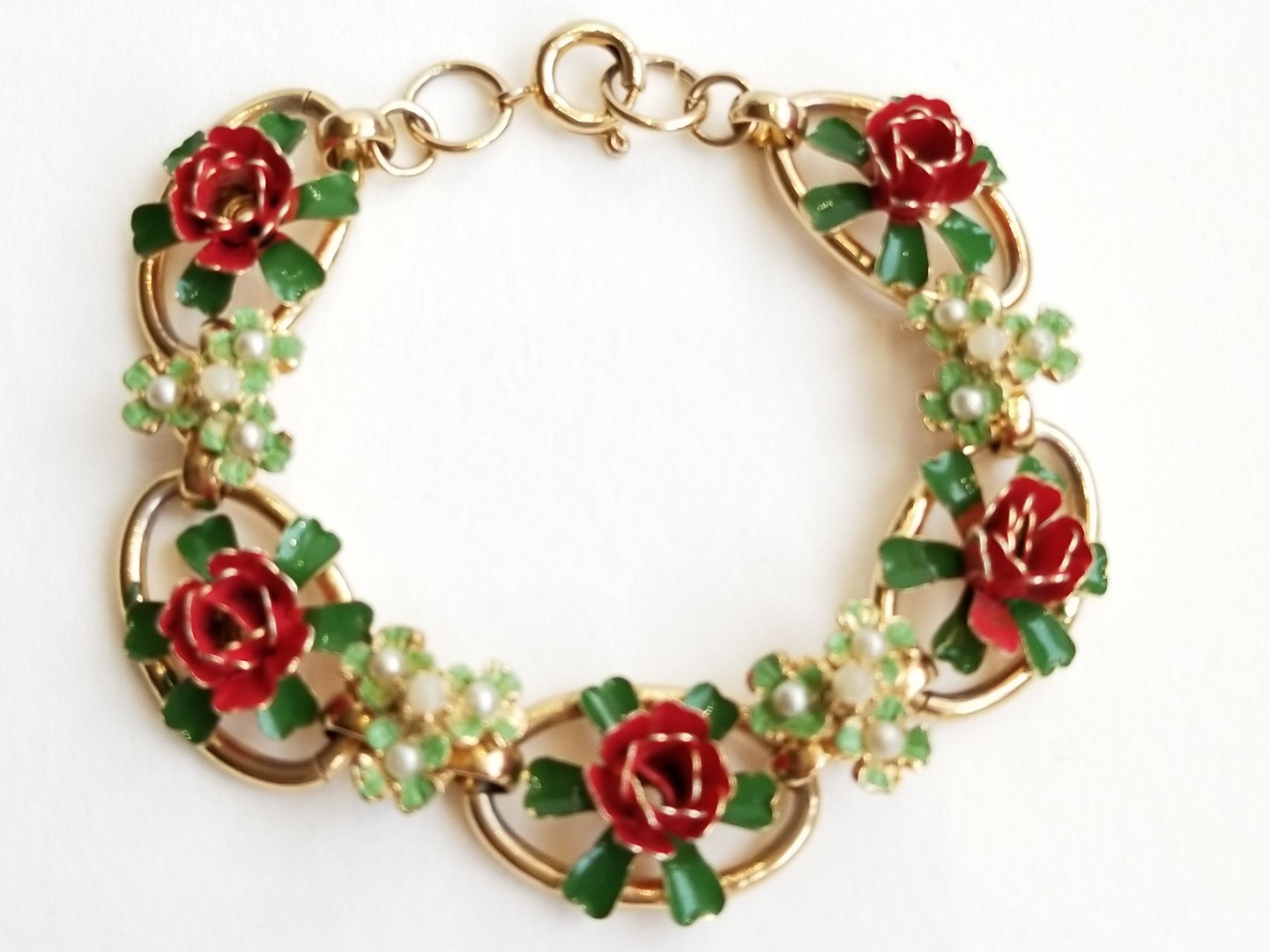 Beautiful Vintage Gold Tone Linked Bracelet with three dimensional Enameled Red Roses, Green Leaves and seed Pearls.