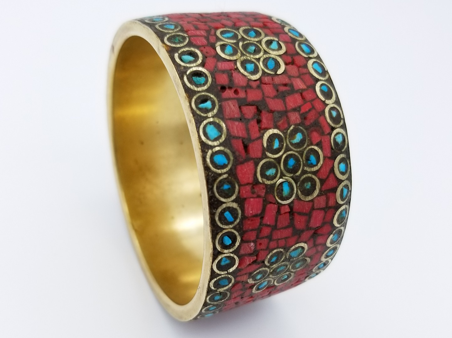 A vintage brass bangle bracelet with Turquoise and Red Coral stone mosaic on a black background with a flower ornament in cloisonné technique. It lost two small rings from floral ornament, but in good vintage condition.