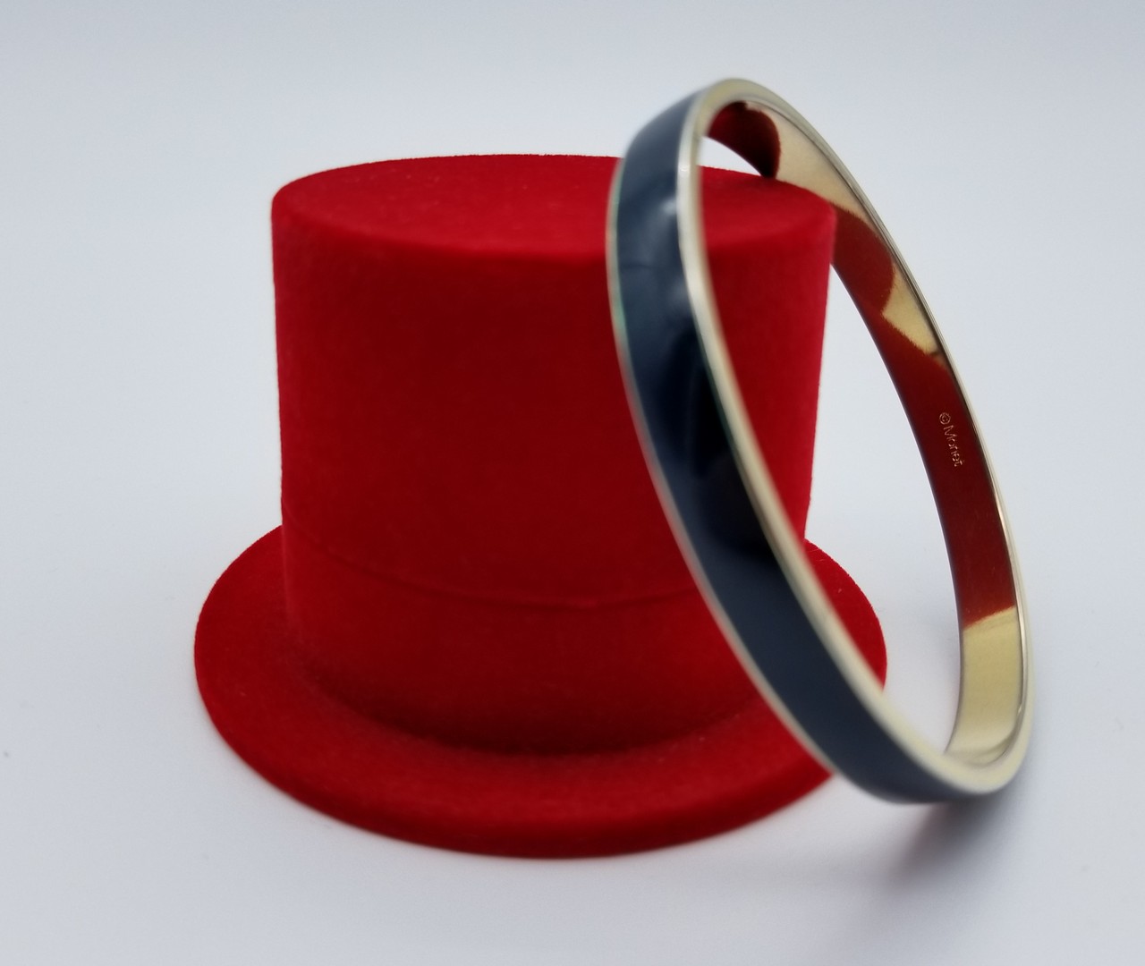 Very elegant 22 K gold plated dark blue enamel bangle bracelet by Monet. Dark Blue enamel center line with gold plated edges and gold plated inside part. The enamel in excellent condition, no damage.