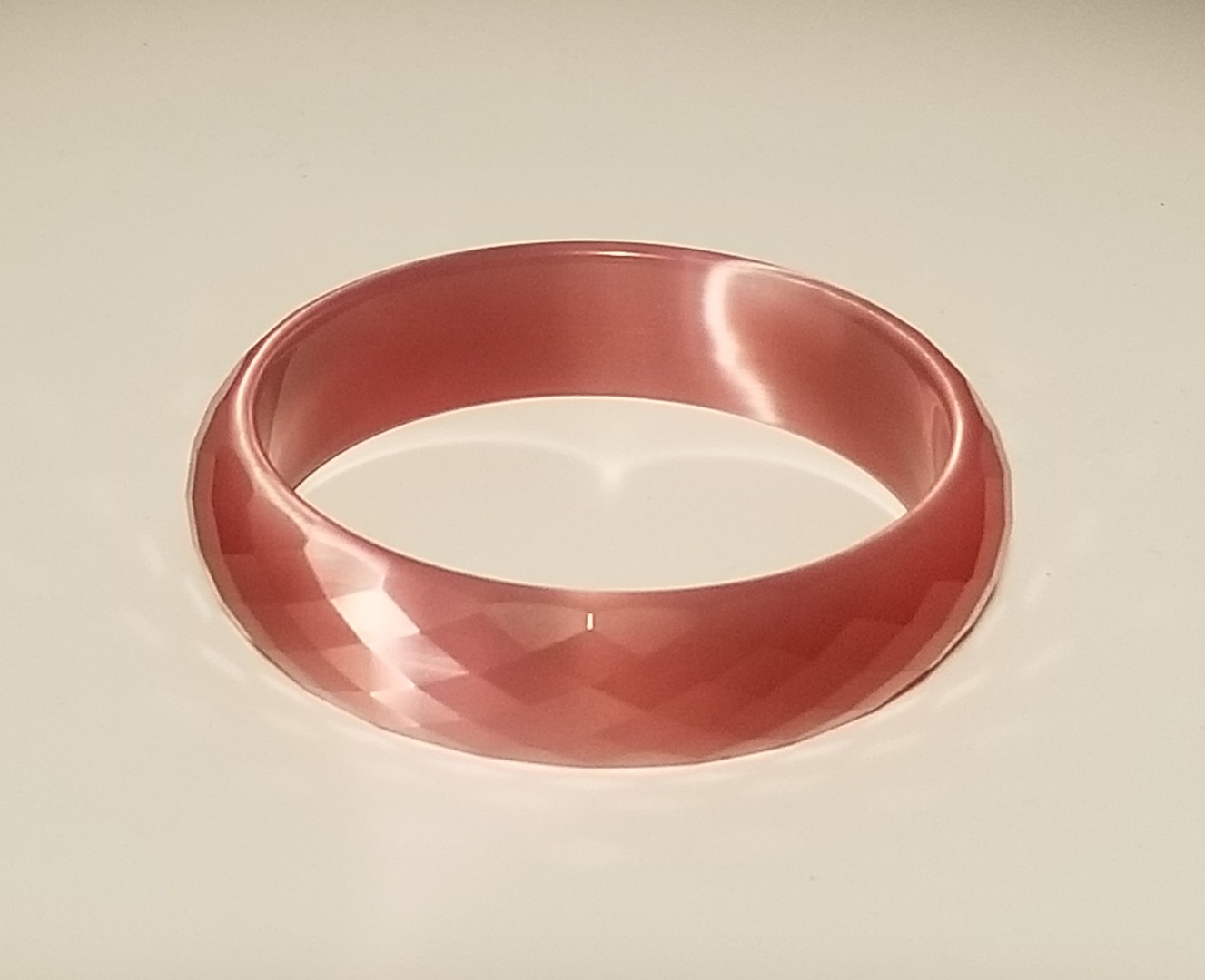 A lovely vintage faceted cat’s eye pink solid quartz crystal gemstone bangle bracelet. Cat's eye effect with reflecting light to catch the eye. Color shades continually change with the light.