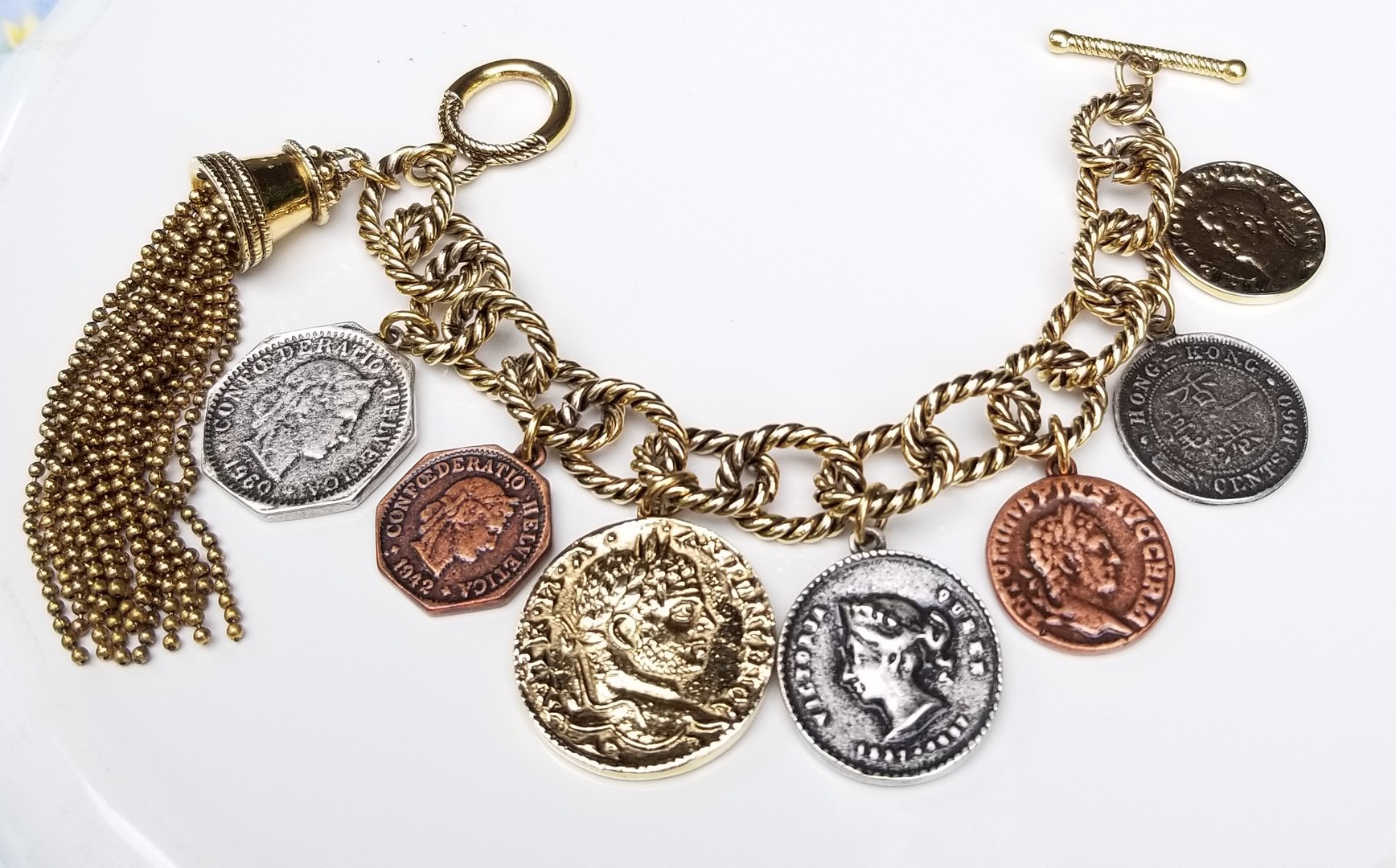 This is a stunning Designer Signed CAROLEE Gold, Silver and Bronze tone metal, Roman Warrior coins charm bracelet with tassel accent and toggle clasp. In excellent vintage condition. A very rare and collectible piece.