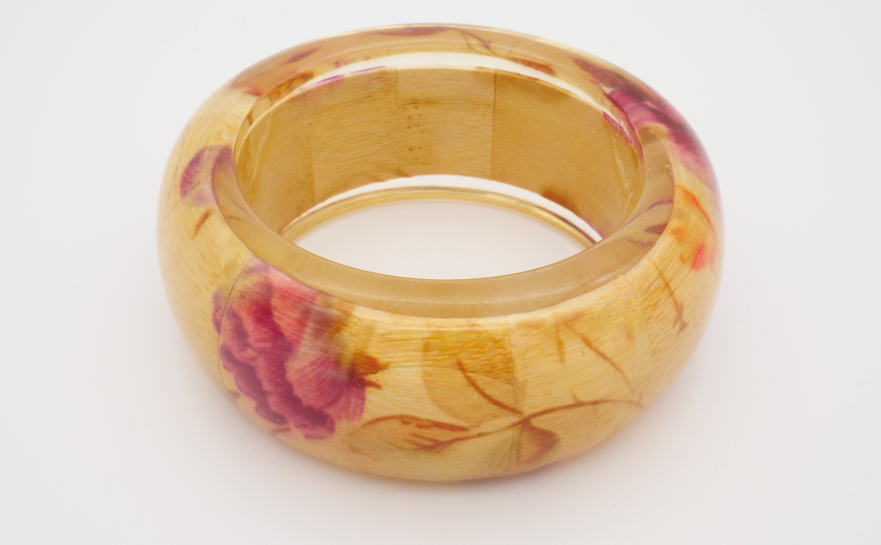 A beautiful vintage chunky statement Lucite bangle bracelet with real colored wood inside the Lucite.