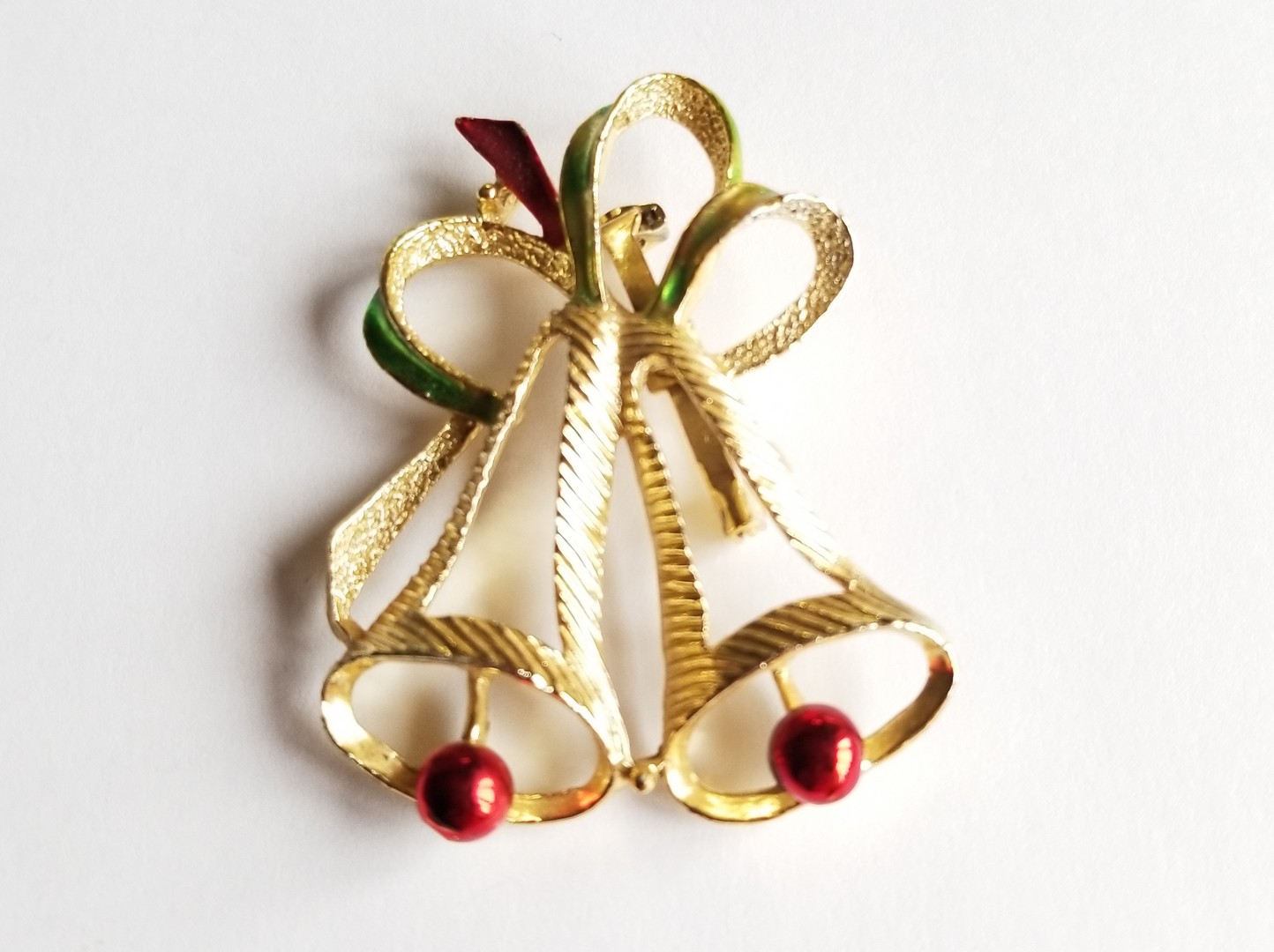 Very pretty gold tone Christmas tree brooch pin. It is a filigree gold tone metal with enamel red and green ornaments. Signed AAi (Accessories Associates, Inc.). The closure roll over clasp is in working condition. The brooch is in great vintage condition. Vintage 1980s.